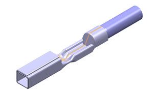 古河電気工業は、この問題を新技術で克服した。新たに開発した防食端子「α端子シリーズ」は、一般端子と同様に高速プレス機にて成型した端子の圧着部を、古河電工保有の光ファイバレーザの溶接技術を用いて密閉した管構造(図2)にした。そして、ワイヤハーネス製造工程において、アルミ電線を圧着すると同時に電線端部被覆をかしめることで(図3)、気密性の高い優れた防食構造を実現した。