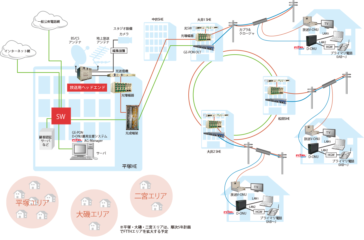 二宮町・大磯町・平塚市に順次5年計画でFTTH伝送路設備を敷設していく予定です。設備に関しては現加入者を100%移行することを目標に、将来の加入者増にも対応できるよう設計しています。