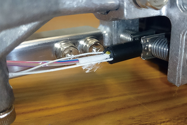 また、今期より実施中のFTTH設備へのマイグレーション期間は、共架柱への2重共架期間もあるため、負荷の少ない軽量な光ファイバケーブルの選択も重要視し、従来のSZスロット型ではない、間欠接着型4心テープを使ったスロットレス型ケーブルを採用しました。外径が3割近く細径で質量が約半分になりますので、共架申請での共架柱の建て替え、ルート変更などが大幅に減り、工期短縮に役立っています。