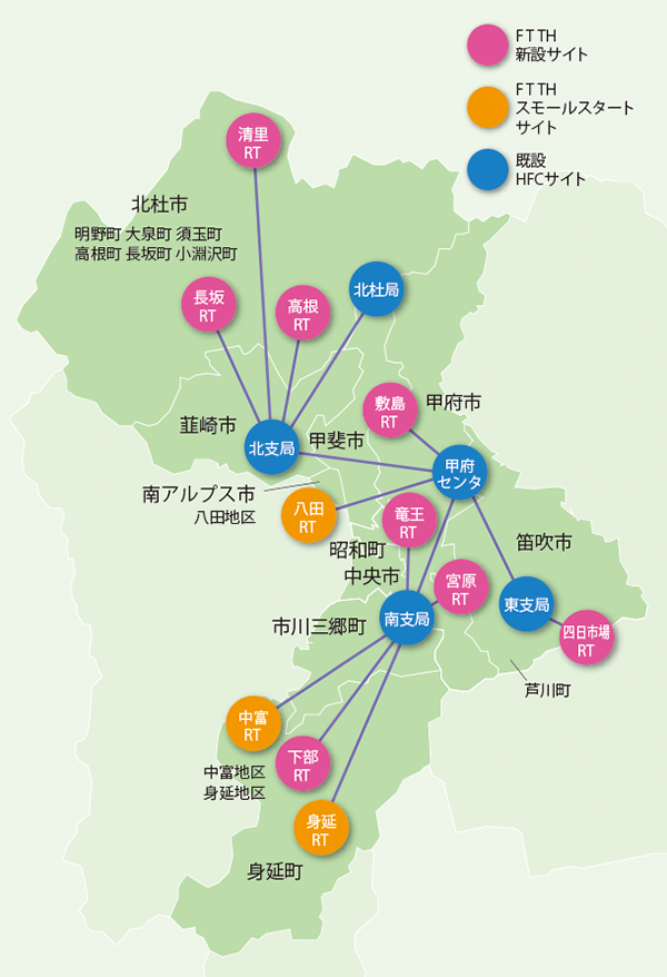 甲府駅周辺の200世帯を対象として開局した日本ネットワークサービス様(略称NNS 本社:山梨県甲府市)は民間企業としては先駆けとなる1970年に民放の再放送(再配信)を目的として開局。翌1971年には日本で初めてCATV双方向機能を使った生放送の伝送実験を実施しています。1995年からHFC設備への改修に着手し、インターネットサービスの提供を開始しました。2010年からは一部の地域でFTTHを導入して設備の維持・メンテナンスやサービスの拡張など、オール光化への検証を重ねました。