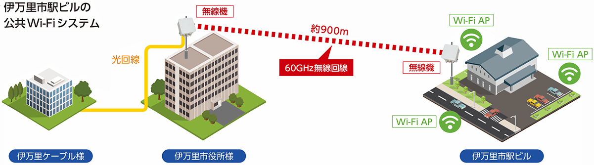 駅ビルの公衆無線を市役所まで無線でつなぎ、そこから先は光回線でインターネットにつなぎます。