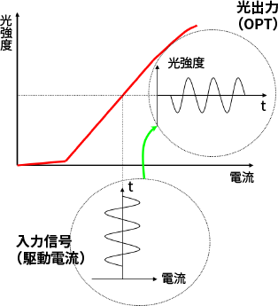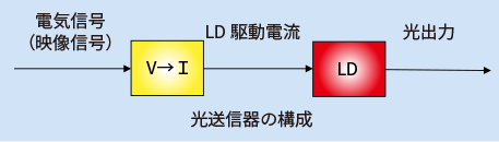 映像信号(電波信号)を光ファイバで送るために、光送信器を使います。複数のチャンネルの映像信号は、それぞれ異なる周波数の電気信号で送られます。この電気信号を光送信器で光信号に変換し、光ファイバケーブルに送出します。光送信器を構成する主要な素子はLDで、位相の揃った光を発光し、光の信号の強弱を利用して信号伝送をします。この方式を強度変調方式といい、CATVなどでの映像伝送に使われています。光の強弱の度合いを光変調度(消光比)といいます。この光変調度は高すぎても低すぎても正しく伝送できません。例えば伝送チャンネル数が多くなると、光の振幅が大きくなるので、光変調度を下げる必要があります。
