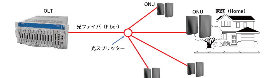 PONの特徴は、通信会社の通信機器室から家庭まで光信号だけで伝送されているだけでなく、ネットワークを構成している機器がすべてPassive機器で構成されているという点です。