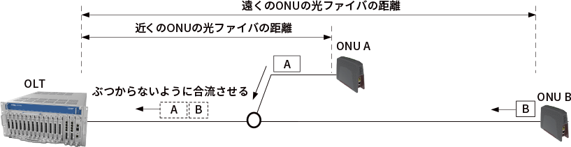 ONUの設置場所によって上り光信号の到達時間が異なるよ。