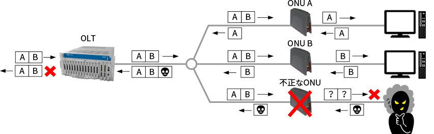 PONは、下りの信号をブロードキャスト型で送っているため、悪意のある人がONUを接続して他人のデータを盗み見しようとしてもできないようになっています。例えば、下りフレームではOLT側で暗号化と暗号化キーを生成して、ONUに送るために不正なONUを接続してもデータを盗み見できないようになっています。