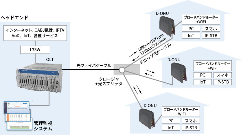 また、上りフレームもOLTでデータをすべて確認して転送しており、認証されていないONUからの不正なデータもOLT側でブロックする仕組みが施されています。さらに、分配しているONU同士(OLTを折り返すケース)もPON回線のみでは接続ができないようになっているなどのさまざまな工夫がされています。
