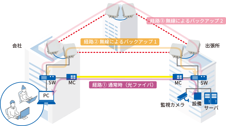 光ファイバなどメインの有線ネットワークに対して、無線でバックアップ回線を構築することが可能です。EtherHaul600TXには冗長機能があり、無線区間においてもルート冗長することが可能 です。