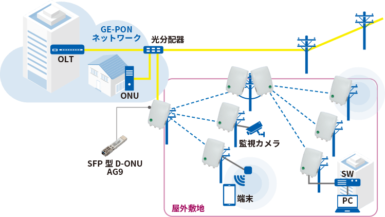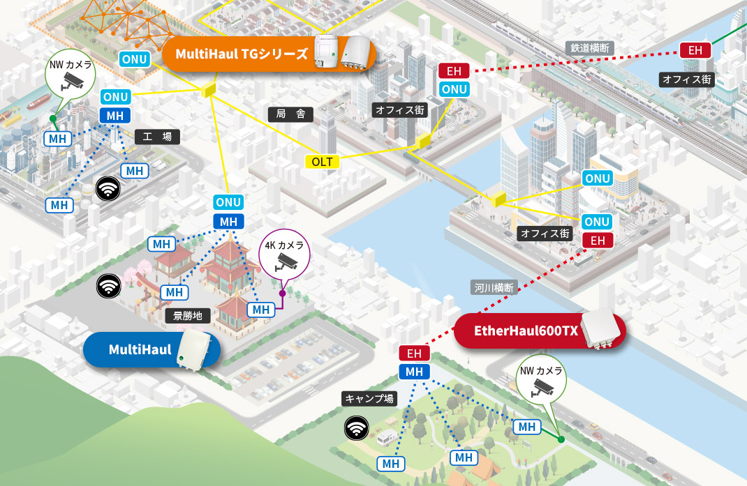 マルチ接続により、有線化が困難な屋外商業施設や、景観を重視したエリア、工場の敷地内などへ高速ネットワークを提供