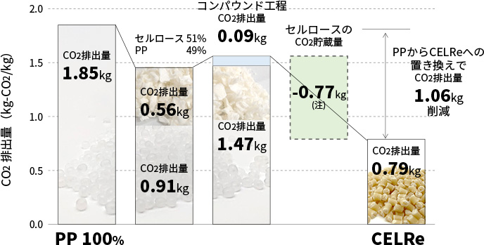 セルロースは41%が炭素であり、1.0kgあたり1.5kgのCO2を貯蔵しているとみなせるため、セルロース繊維製造時のCO2排出量1.1kgから上記1.5kgを差し引いた値を用いて計算しています。