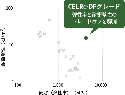 セルロース繊維を51%含有するCELRe® KCPグレードの他、強度と耐衝撃性を両立したCELRe® DFグレードを展開します。