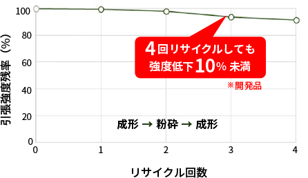 お客様でのCELRe®成形時に発生する端材(例えばスプールランナー)を粉砕し製品に戻しても強度低下がほとんどなくクローズドループリサイクルによりCO2排出量削減、材料コストの削減に貢献します。