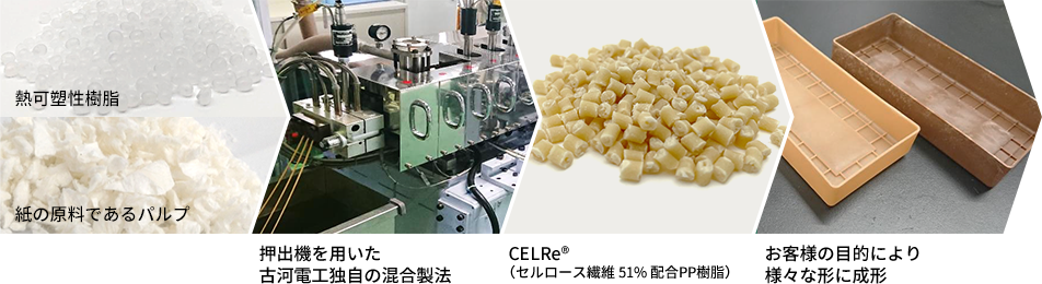 当社が光ファイバケーブルや電力ケーブルの製造などで培ってきた樹脂混練技術を活かして、パルプと熱可塑性樹脂を二軸押出機で混練、ワンステップでマイクロオーダーのセルロース繊維を樹脂中に高分散させる技術を確立し、強度と耐衝撃性を両立したセルロース繊維強化樹脂CELRe®を開発しました。