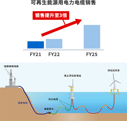 电力事业方面,以日本国内超高压地下电缆、日本国内可再生能源(海底电缆+地底电缆)、海外海底电缆(亚洲)为目标市场,致力于扩大事业。其中,日本国内可再生能源方面,随着可再生能源导入的扩大,计划截至2025年将销售额提升至3倍。