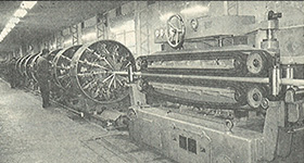 当时,在横跨太平洋的海底电话线路同轴电缆的遮蔽材料中,大量使用了本公司的铜条。该铜条需要具有较高的板厚精度,并且还是当时令人惊异的长尺寸产品。本公司为了完善该遮蔽材料的供应体制,自行设计并生产了具有超高精度的轧机,顺利地完成了交货任务。