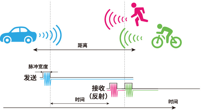 传统的监控雷达一般使用频率调制连续波方式,“连续”地发送电磁波,根据发送波与接受波的频率差检测对象物。但是,因为保险杠内有很多反射物,所以这种方式会导致测量不稳定,或者当货车等大型障碍物靠近时其他对象物的信号被遮盖,在稳定的测量性能上存在课题。