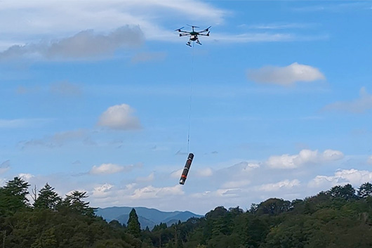 另一方面,如果使用特殊大型无人机,往返3分钟左右,就可以运送大约350m的距离。因此,可为大幅缩短时间,实现省力化,提高作业者的安全性做贡献,可望解决各种各样的课题。