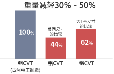 在铝导体电缆流通与以往的铜导体电缆相同电流时,需要干线电缆的尺寸大出1号,即便如此,其重量仍成功减少约30%。