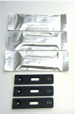 本开发品的设备形态与普通的免疫色谱检查工具相同,都是由Quartz Dot、试验片、提取液组成。检查方法是将经过提取液处理的标本与Quartz Dot混合,再将该混合液滴到试验片的端部,通过荧光镜观察试验片的荧光发光,判断是否检测出。