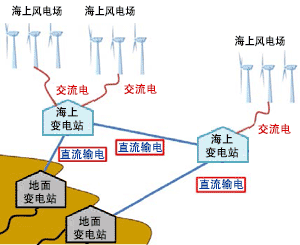所谓多端直流输电系统,是指通过多个海上变电站将设置于海上的多个风电场所发的电收集起来,并在转换成直流电后输送到多个地面变电站的输电系统。通过输电损失较少的直流方式能够高效地在海上变电站和地面变电站之间、以及两个海上变电站之间进行长距离输电。通过多端化处理,可以在不新建地面变电站的情况下,将设置于远离大规模需求地区的、适合风力发电的场所的多个风电场所发的电力高效地输送到可接入量大的现有系统。