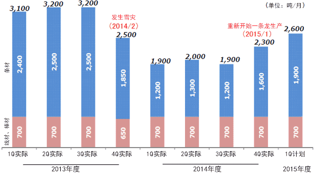 2014年2月发生的雪灾导致一条龙生产停止,铜条产品的生产数量跌至以前的60%左右。尽管如此,通过采取按计划修复及事先取样的应对措施,2015年1月之后的生产数量顺利恢复,预计本年度第一季度可恢复到以前的85%左右。