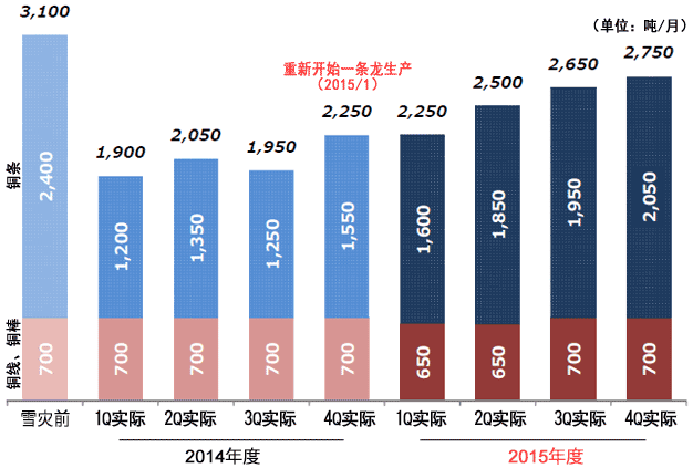 受2014年2月发生的雪灾的影响,本公司铜条产品的生产业绩降到了雪灾发生前的60%左右,但2015年1月重启一条龙生产后,顺利恢复了生产,2015年度第4季度的月产量达到了 2,750t(为雪灾前的89%),实现了2015年度全年的生产计划。