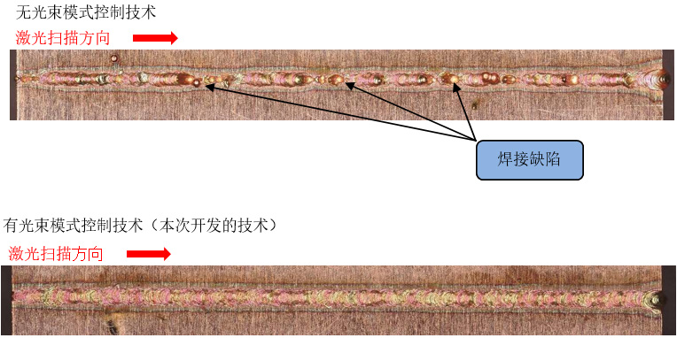 这次,古河电工与古河机械金属的全资子公司——古河电子株式会社(以下称为“古河电子”)合作,成功开发出可大幅减少纯铜焊接时可能发生的缺陷的激光焊接技术。通过融合古河电工产光纤激光器的“高能量密度光束”和古河电子开发的“光束模式控制技术”,确保在纯铜焊接时形成最佳光束模式,与以往方式下的焊接相比,缺陷量(溅射及气孔)减少了原来的95%以上。