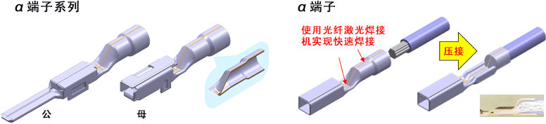 本公司领先全世界成功开发出具有世界顶级水平的防腐端子“α端子系列”。它具有优异的防腐性能、可降低防腐处理成本、可适用于现有连接器外壳、可用于铝制电线W/H。现已确定将在本公司的三重事业所量产全部21个种类的该系列端子,并且今后还将继续扩大产品阵容。