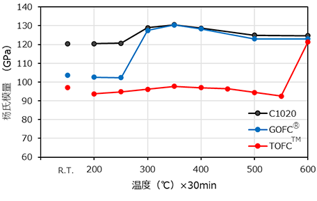 除传统无氧铜(C1020)外,古河电工已采用自主的材料设计与制造技术,实现了抑制高温粘接过程中晶粒粗化的耐热无氧铜“GOFC®”的量产。而且此次,公司进一步将低杨氏模量耐热无氧铜“TOFC™”纳入产品阵容。TOFC™在保持高导热性的同时,实现了即使在高温环境中也不发生软化的耐热性能(图1)。其结果,即使在300 ℃以上的温度下进行焊接或树脂粘接,仍能保持无氧铜的硬度,有望抑制翘曲或变形。此外,TOFC™成功实现了在600 ℃以下的温度范围内仍保持低于传统无氧铜的杨氏模量(图2、表)。这一特性有助于抑制在热膨胀系数不同的材料之间的粘接界面处产生剥离等,有望大幅提升连接可靠性。