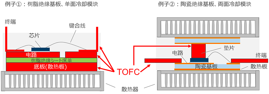 凭借这些特性,TOFC™非常适用于高功率半导体模块的散热板及端子,如截面示意图(图3)所示。另外,通过将其应用于需要高耐热性的大电流母线槽(铜排)等,相较于传统无氧铜或纯铜,可抑制高温使用条件下的强度下降,有望进一步拓展至可再生能源逆变器及xEV的功率控制单元等应用场景。