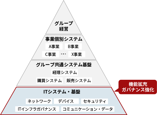- グループITガバナンス整備:グループ全体のガバナンスを強化し、IT最適運営に向けて投資の適正化