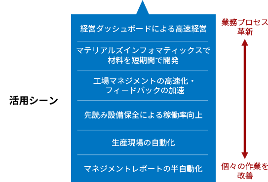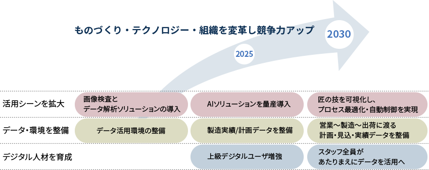 具体的にはSFA/MES/生産計画のシステム整備に同期して、経営ダッシュボードを充実させていきます。活用シーン拡大を加速するために、需要が多い重要なソリューションはデータの収集・蓄積・加工・活用をパッケージ化して「デジタルソリューションの型」として整備し、事業部門へのクイックなデリバリーを実現していきます。