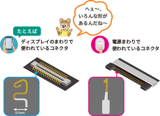 ディスプレイやアンテナ、カメラ、スピーカーなど、さまざまな部品と基板をつないで電気や信号を伝えるために、スマホのあちこちで「コネクタ」がお役立ちしています。