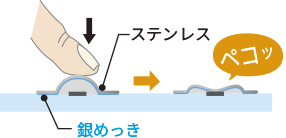 ボタンには繰り返し押しても耐えられるステンレス素材の薄い板が使われています。ステンレスは電気を通しにくいため、内側に銀めっきをして通電しやすくしています。ステンレスは、めっきしづらい性質ですが、ここで古河電工グループのめっき加工技術が活躍!薄く銀めっきをして、ボタンを押したときに電気が流れるのにお役立ち