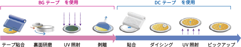 この小さな半導体チップを製造する工程では、BGテープ、DCテープと呼ばれるATテープ(Advanced Technology Tape)が活躍しています。