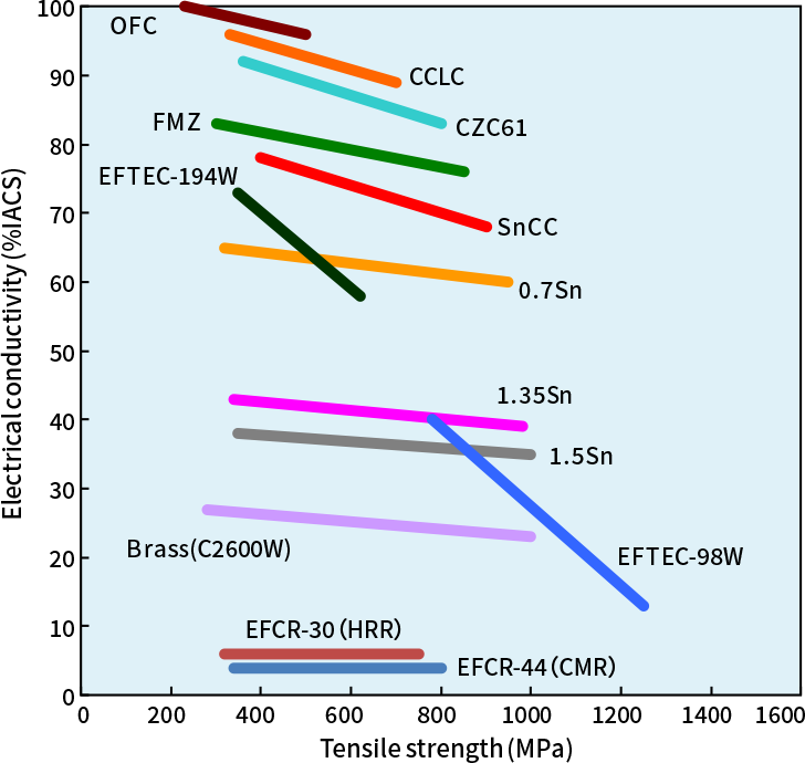 | EFTEC-98W | Corson copper | Cu-3.75Ni-0.9Si-0.5Zn-0.15Sn-0.1Mg | Good strength, high conductivity and excellent stress relaxation property. |