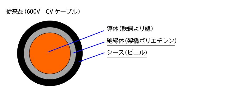 - 従来品は絶縁とシースの2層構造でしたが、絶縁性シース材の1層構造となり、製造材料と工程がエコロジカルです。