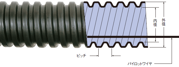 (注)お求めいただく場合のエフレックスの呼び径は、中に収める電力ケーブルの仕上がり外径の約1.5倍、2条以上の場合は外接円径の約1.5倍の内径のものを選択してください。なお、ケーブル引き入れ時にプーリングアイなどの大きさも配慮してください。(通信ケーブルは仕上がり外径の約2倍、多条の場合は外接円径の約2倍の内径のものを選択してください。)