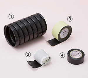 ①のスリーブをエフレックスの片側にねじ込みパイロットワイヤをつなぎ、他方のエフレックスを突き合わせてスリーブを逆方向に回して、両エフレックスをつなぎます。そして、スリーブの両端部に②のシーリングテープを巻き、その上に③のエフレックスバルコを巻き、巻き終りを④のPVCテープで止めます。