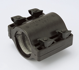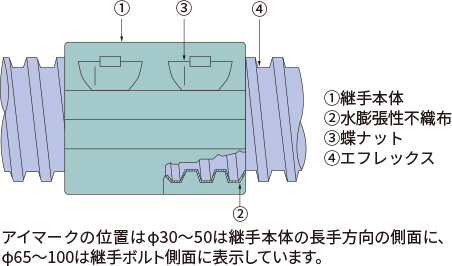 接続部のエフレックス表面の水、泥などをウエスでよく拭き、エフレックス内のパイロットワイヤ相互を接続します。エフレックス相互を密着させ、2つ割り継手をかぶせ(継手のかぶせ方向に注意し、アイマーク方向を一致させる)蝶ナットを付け、手で締め込みます。
