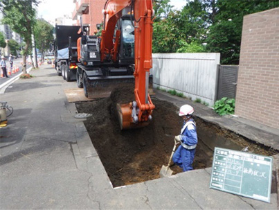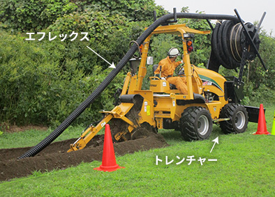 通常は管路を埋め込むための溝を掘削したあとに管路を敷設しますが、本工法では掘削と管路の敷設を同時に行うことで、工期短縮、コスト低減を図ることができます。