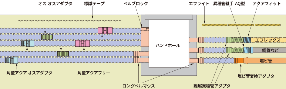 「エフレックス」と同様に軽量で曲げやすいのはもちろん、「角型エフレックス®」は波形状の山部が角型、谷部が丸型なため、管自体を積み上げる多条多段配管が簡単です。コンパクトで掘削量も少なく、ハンドホールも小さくできます。
