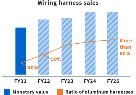 While leveraging the strengths of the Alpha Terminal®, including high corrosion resistance and a fully in-house production system, we will further contribute to reducing vehicle weight. In particular, aluminum wiring harnesses using Alpha Terminals® were equipped in 56 vehicle models of 6 manufacturers in FY2021, but this will increase to 100 models of 8 manufacturers in 2024.