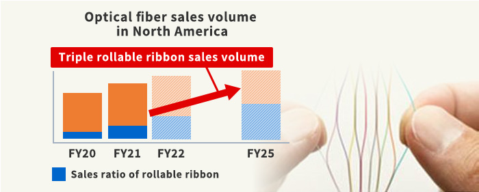 Furukawa Electric has set forth as the goal for FY2025 to further expand the high value added products filled with original technology and know-how, and grow sales. One major step will be shifting from general-use products to rollable ribbon cable and achieving a sales ratio of 50% in the main North America market by 2025.