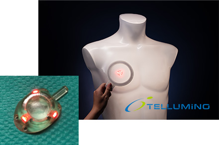 First, let’s look at “TELLUMINO” that finds using light. The technology enables the visible confirmation of implanted medical devices from outside the body. This makes it possible to use the existing CV ports of medical device manufacturers more safely and realizes “CV ports that light up” to provide safety and security to both patients and medical practitioners.