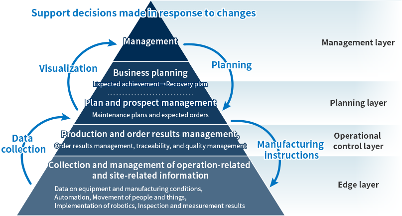 | Operational control layer | Revamp production planning, actual results and cost management based on the deadline for renewing factory IT Promote data utilization through the integrated development of data infrastructure Reduce investments through standard packaged solutions |