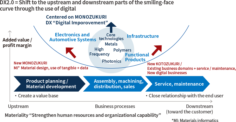 Concerning the DX promotion organization, in order to strengthen the functions centered on promoting DX of the group, the existing Digital Innovation Center was integrated into the ICT Strategy Planning Department in FY2023, and the Digital Transformation & Innovation Center (DXIC) was established. In this way, including the affiliate company Fitec, a framework has been created to integrate the planning and drafting of AI/IoT solutions and MONOZUKURI DX as well as the planning, implementation and operation of IT infrastructure, core systems and business systems. Further efforts are underway to enhance the personnel (skill training & increase engagement) of DXIC as a one-stop enabler of digitalization.