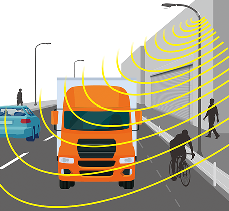 Peripheral monitoring radar is not only used in vehicles. It is also installed in forklifts used in factories, logistics warehouses and other workplaces. Forklifts are often used in spaces that are crowded with people, goods and other vehicles, as well as in workplaces where sensors tend to get covered up (with water or dirt), poorly lit workplaces and at night. As a result, there is a need to increase safety and resistance to the environmental conditions. The use of peripheral monitoring radar is growing as one means of responding to this need.