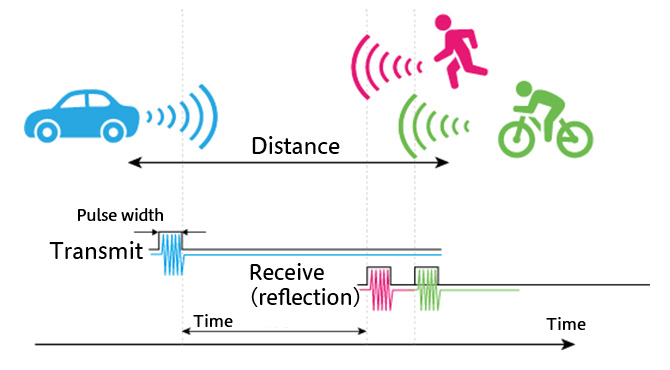 On the other hand, peripheral monitoring radar using the pulse method, such as the radar developed by Furukawa AS, broadcasts electromagnetic waves “intermittently” and measures the “distance” to the object based on the time until the return signal is received and the “relative speed” of the object based on the frequency of the return signal. In this way, it is possible to separately measure the distance and speed and individually detect multiple objects, such as obstructions, people and signs. Also, because the 24GHz quasi-millimeter wave band features relatively low attenuation in situations such as rain and low transmission loss when passing through the bumper, it has excellent detection performance.