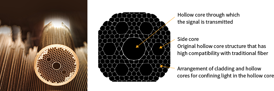 Compared to optical fiber that uses a glass core with high refractive index to confine the light, Hollow Core Fiber is a revolutionary fiber that confines light in a core (hollow) with low refractive index. Using cladding to create a standard hollow core array structure, whereas light could only be confined in a core with high refractive index, the new fiber realizes a completely new principle of confining light in a hollow core with low refractive index. Also, utilizing an original hollow core structure called side core, it is possible to confine only the light necessary for transmission in the hollow core