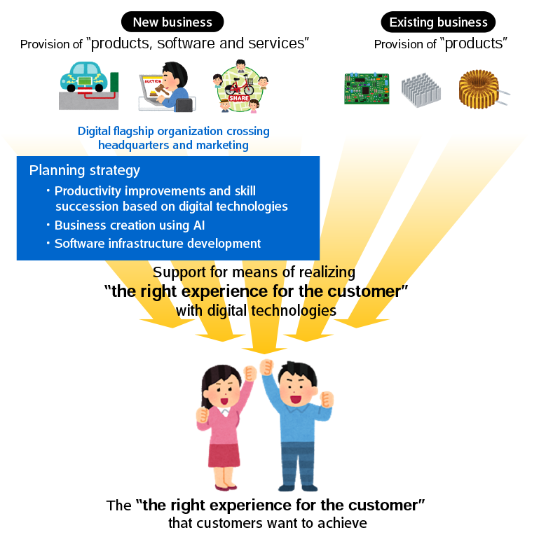 In order to strengthen digital technologies as basic technologies, we will establish a cross-sectoral organization integrating R&D, MONOZUKURI, ICT strategy and marketing divisions, and reinforce our number of AI human resources above 100 people by fiscal year 2021.